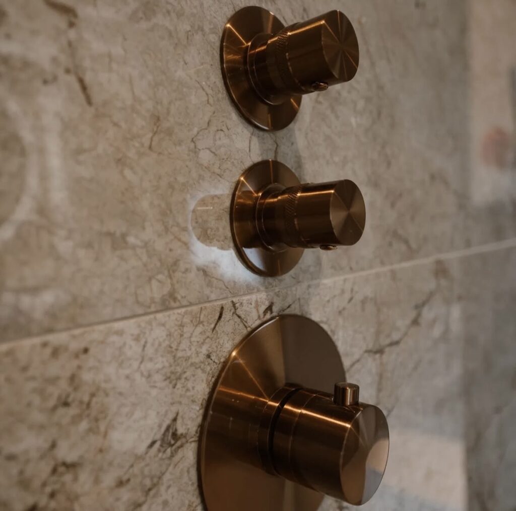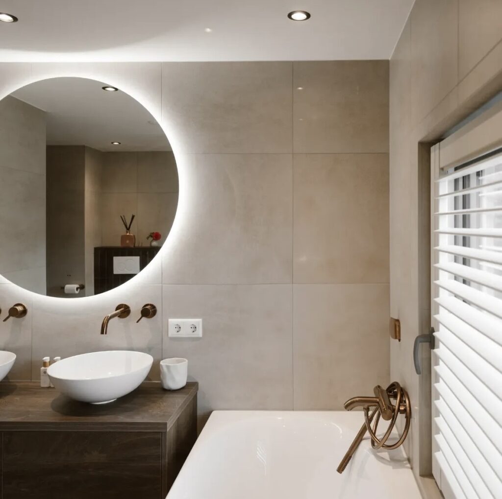 Zandkleurige badkamer met koperen details