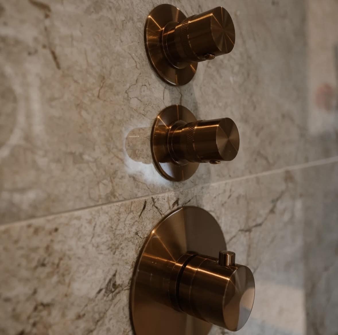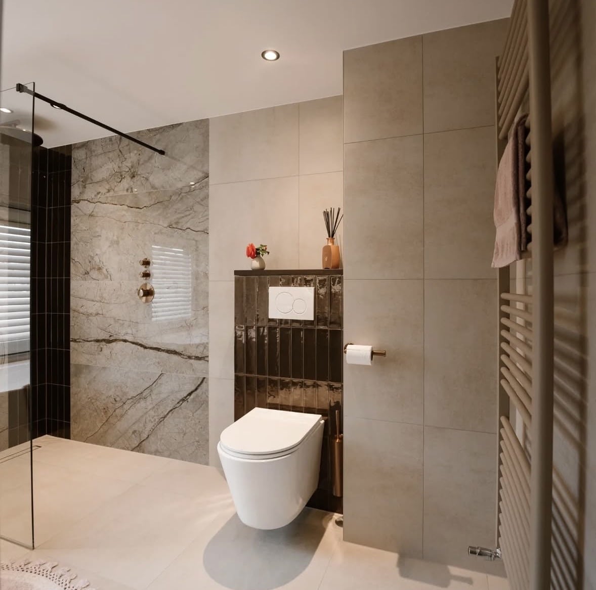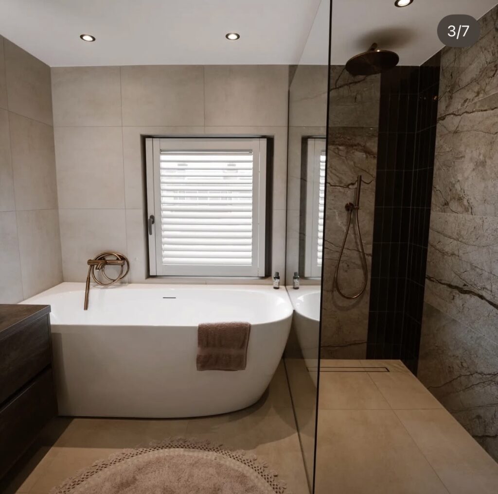 Een prachtige badkamer met een combinatie van rustige, warme zandkleurige tegels samen met een marmertegel. Dit zorgt voor een tijdloze samenstelling waarbij de koperen kranen echt tot hun recht komen. Door de basis rustig te houden zie je accenten er helemaal uitspringen.