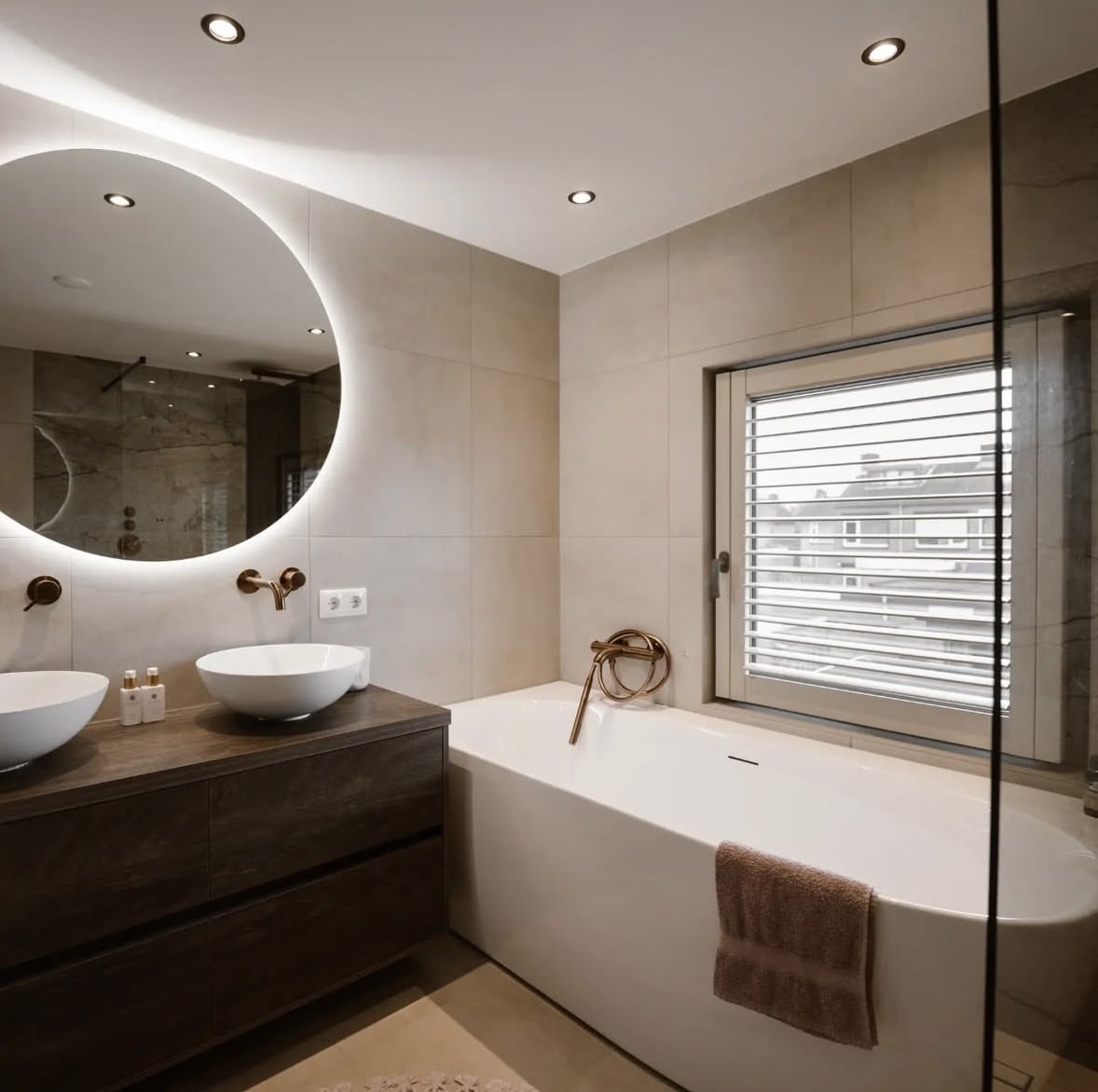 Bekijk projectZandkleurige badkamer met koperen details